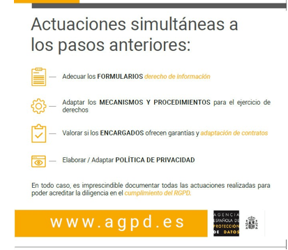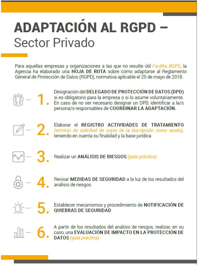 Pues bien, la Agencia Española de Protección de Datos (AEPD), ha ido desarrollando distintas guías y herramientas para facilitar el cumplimiento del nuevo Reglamento, y entre ellas ha publicado una hoja de ruta sencilla con las indicaciones imprescindibles para el sector privado, y es la siguiente: